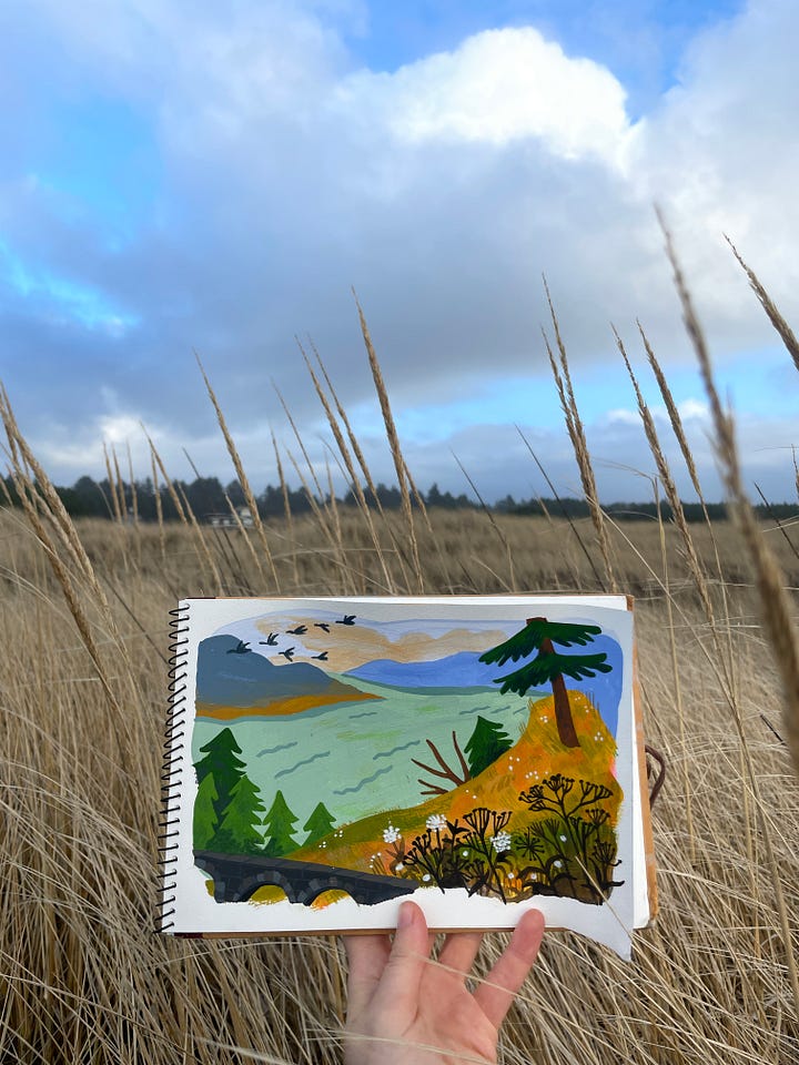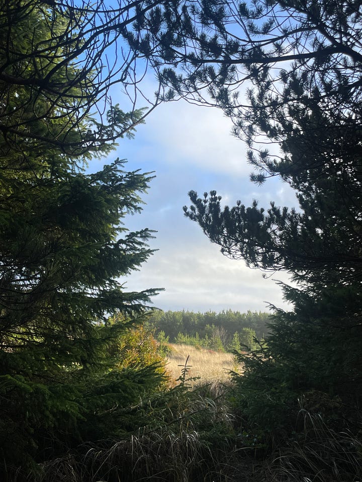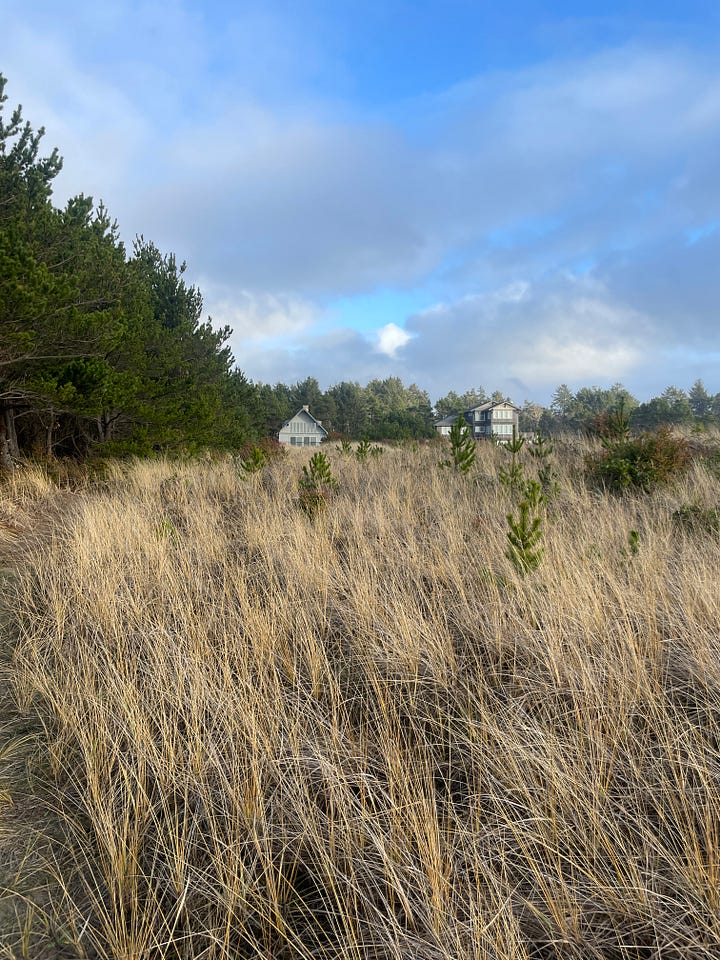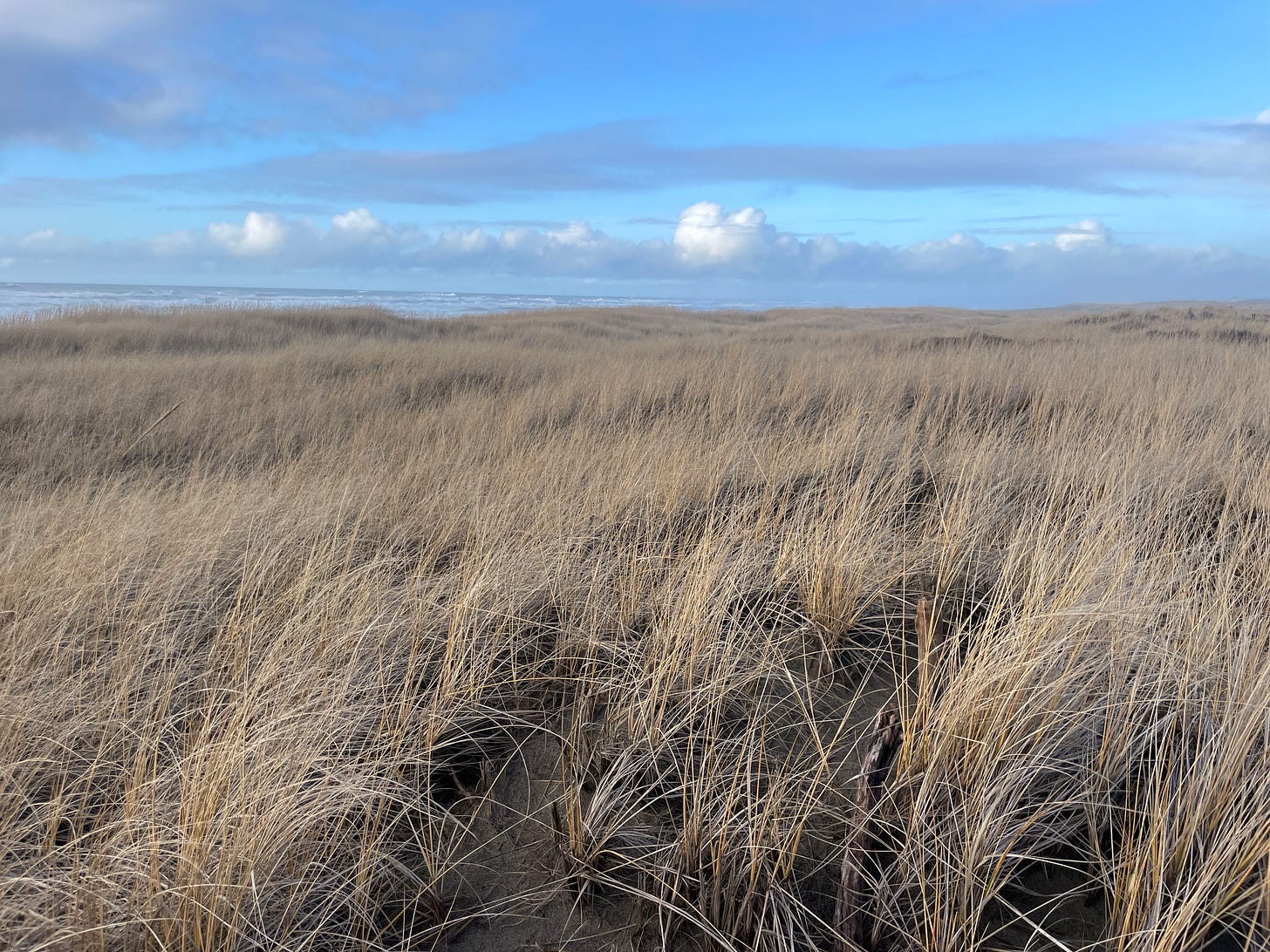 The landscape around the house is scrubby, grassy, and perpetually green. On the way to the ocean there are evergreen trees with needles pointing straight up, the bark nearly black from rain. Beneath the trees are ancient ferns and patches of bright green moss. After the trees end there’s grass – yellow in December – and it’s everywhere. It covers the dunes. Walking beyond the forest, before you even see the waves of the pacific, you walk through an ocean of grass.
